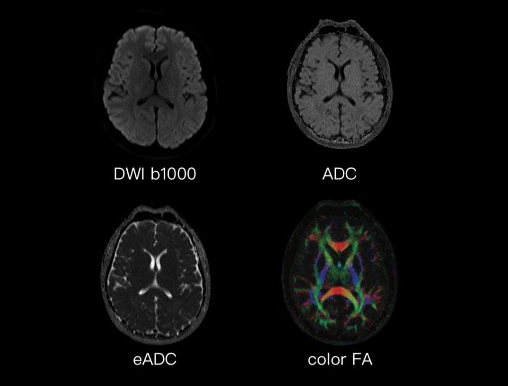 The following parameter maps can be obtained after acquisition: FA, RA, ADC, and color FA, which can reflect the speed and direction of water movement in tissue. Multi-parameter neuro imaging can provide accurate information for disease diagnosis, such as white matter lesions.