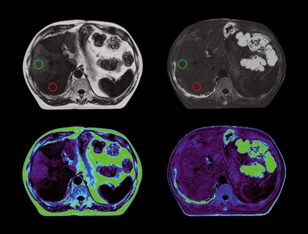 Non-invasive detection of fat content and iron deposition in tissues. Multi-parameter images can be obtained after acquisition and calculation.